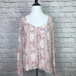 Billabong Boho Printed Bell Sleeve Blouse Top size Small. Scoop neck front with button down details and open back. Pairs perfectly with a pair of skinny or jegging jeans and booties. Lightweight 100% rayon. Burgundy maroon purple and ivory print.