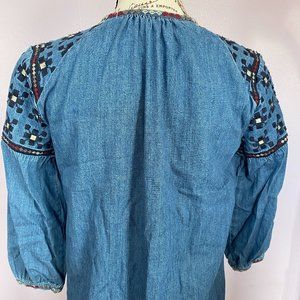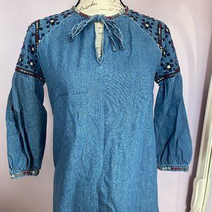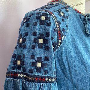 This chambray dress hits right above the knee for me and I am 5'1'' - it is embroidered on the shoulder and has slight puff sleeves. Gently used, only worn a few times. Perfect for spring or fall.