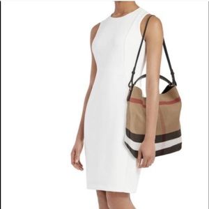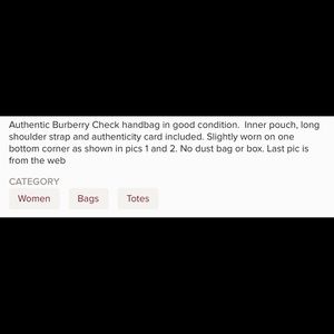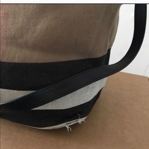 Beautiful and classic Burberry bag! Good used condition except for small rip in photos. Reposhing this item since I just bought a new Burberry bucket bag. Please see last photo for details on item. First photo is stock photo.