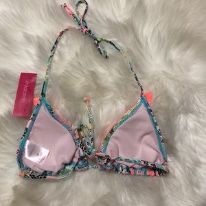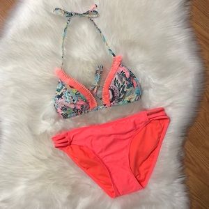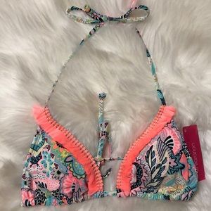 Adorable floral string bikini top with neon coral fringe detail! Removable padding. Halter style