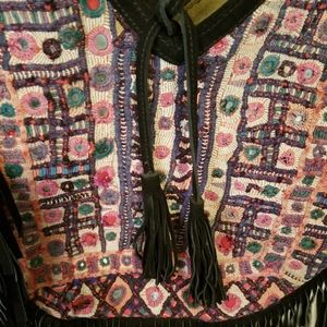 Black suede hobo handbag with multi color embroidery on the bag and handles and suede leather tassels to close the bag with inside pockets. Used a few times and in very excellent condition.