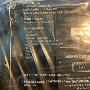 New Rare Black color Delta First Class Amenity Kit with Kiehl’s products. Sealed in plastic. Replica of Tumi’s 19 degree luggage collection. Perfect for travel as toiletries or jewelry case or as a gift. Hard case is no longer available on Delta flights. Last picture shows list of contents. Face mask, tissues, ear plugs, hand cleaner, toothbrush and toothpaste, socks, mouthwash, Delta mini pen, Kiehl’s lip balm and hand/body lotion grapefruit scent.