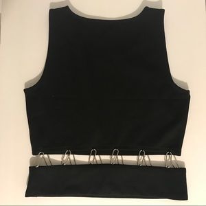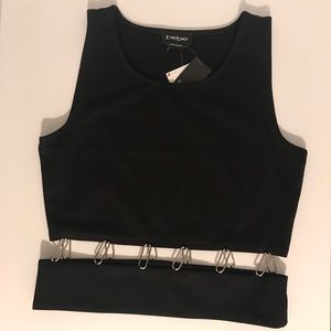 Black top with metal embellishments open midriff, Bebe crop top, muscle top, very unique style. Size small, new with tags.