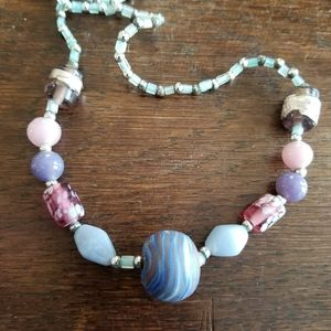 This pretty necklace was handmade by an unknown artist. It has different color beads, some pink, lavender, blue, grey. Silver tone hardware. The beads are made of clay, plastic, and glass. This necklace is in very good condition and is from a smoke free home:) Measures about 22" long.