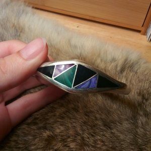 Sterling silver Mexican Taxco stone inlay bangle bracelet. A great minimalist piece with inlay of sugilite, malachite, onyx and some other mystery stone (maybe shell? 😳) A solid piece - can be slipped on the wrist but also opens and shuts with a clasp. Stamped Mexico 925 and with the normal Taxco signature and style, width 2 1/2 inches.