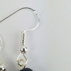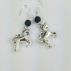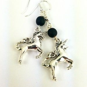 Beautiful Matte Black Czech glass beads with silver plated unicorn charms on .925 Sterling Silver hooks.