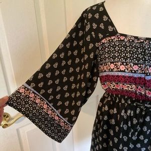 Love this dress! Beautiful colors and patterns complete this dress with an empire waist and billowy sleeves. Perfect boho dress worn with sandals for those summer days! Or wear with boots into fall!