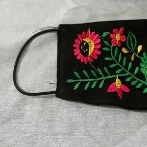 Black with colorful machine-sewn flowers.
