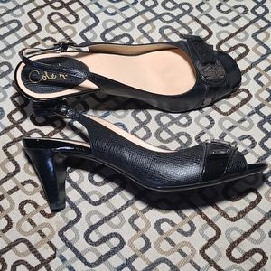 Pre-owned glossy black heels. 2.5" wooden heels. Buckled metal front design. Nike Air soles. Classic style. Never will be outdated. Soles are not worn out. Almost new condition. Because its black, pair with any outfit with ease. So hurry and buy it now!