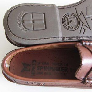Men's rust MEPHISTO ( Model: Cap-Vert ) hand-stitched penny loafers with aniline-dyed water-repellent leather, padded tongue, soft leather lining, leather-covered Air-Relax cushioned insole and 100% caoutchouc shock-absorbing sole. Anatomically designed fit for proper heel and arch support. Size: 8 ( Mephisto ) or 8 1/2 ( US ). Made in Portugal. Condition: New with defects. Note: Heels ( edges ) are slightly sanded down. Minor creasing at upper.