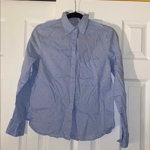 Cotton, hidden button tab closure, crewneck, one breast pocket, sleeves can be rolled up and secured, relaxed fit, 34” bust, 23” sleeves, 24” length, has minor stain on inside of collar, in good condition