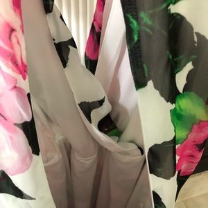 Midi dress in bubblegum floral print. V-neck. Shorter in front, longer in back. Tiered fabric layers at bottom. Zip closure with hook at top.