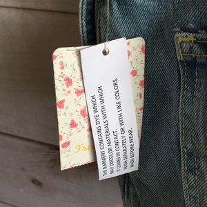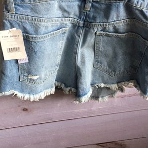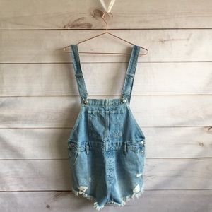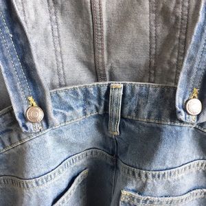 New with tags, never worn. Simple cutoff shortalls with frayed hem and distressed detailing, moonbeam wash, straight neckline, adjustable shoulder strap buckles, four-pocket style, front bib pocket, buttons at the sides. Straps can be worn straight of crisscrossed.