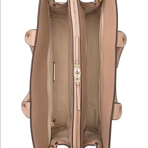 Interior features 1 center zip divider compartment, 1 back wall zip pocket, and 2 slip pockets