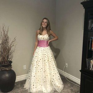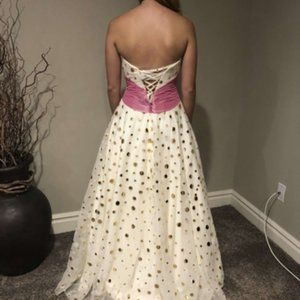 MY DARLING COUSIN MODELED THIS FOR ME. IT IS A STRAPLESS DRESS. THE BOLD PINK SASH MAKES A STATEMENT, NOT TO MENTION THE OVERLAY WITH THE GOLD POLKA DOTS. IT WOULD BE PERFECT FOR THAT BRIDE THAT DOESN'T WANT THE WHITE OR IVORY DRESS. ITS A SIZE 4 AND WITH THE CORSET BACK DEPENDING ON YOUR BUST SIZE IT CAN GO FROM 2-8. I THINK IT WOULD ALSO MAKE AN AMAZING QUINCEANERA DRESS.