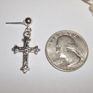 Listing is for one single earring. Brand new and handmade by me - wvluckygirl. Handcrafted with an antiqued silver toned costume jewelry cross charm with vines that dangles and drops from a ball. Has a silver post zinc alloy (lead safe & nickel safe) stud back for his pierced ear. Measures 1 1/4 inches tall & just over 5/8 inch wide. Earring weighs 1.6 grams. Lightweight! Makes a great gift idea for him or her.