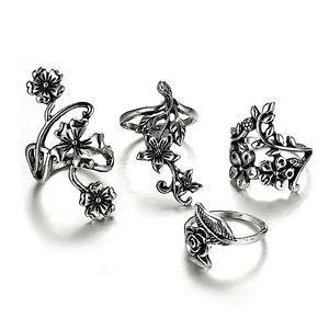 Brand new boutique item. Set of 4 silver colored metal rings in different floral & vine designs. See pictures for details.