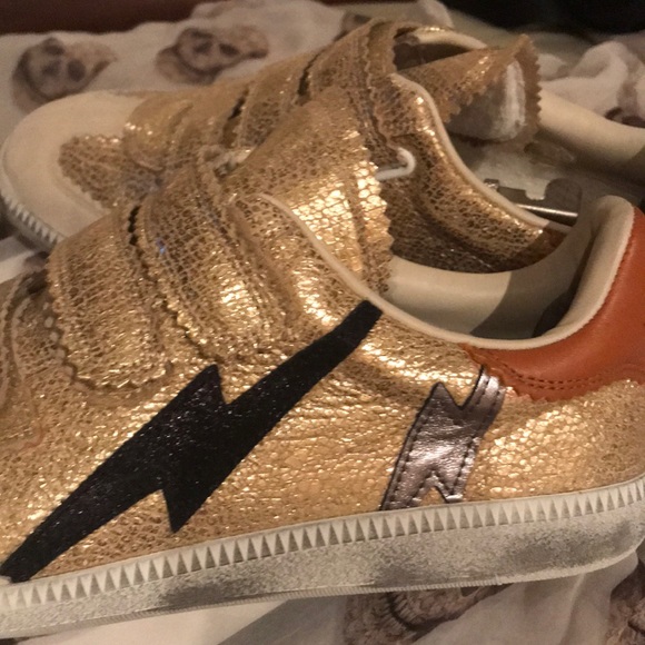 Brand new without tags.velcro closures, pinking sheer finished gold leather.