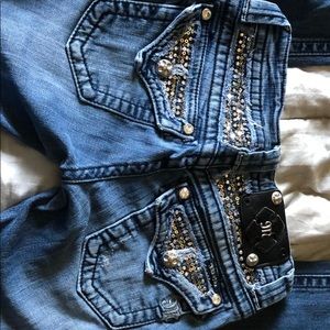 Miss me jeans with sequin and gem designs on back and on front pocket.