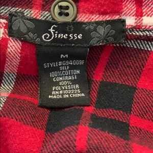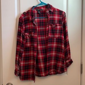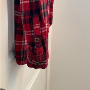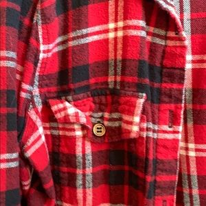 Flannel shirt. Very flattering on. All the buttons and extra buttons are still attached.