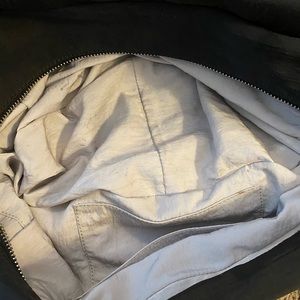 Nylon and black leather. Good condition does have some pen marks inside and the frog has scratches. Outside great condition.