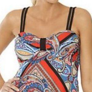 Features babydoll tankini style, Foam Cups, multicolored scarf print, straps that unhook at back for Crisscross style