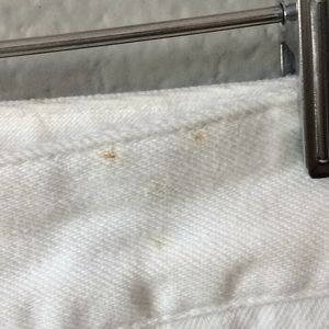 White bootcut jeans. Very comfortable as it has some stretch. Small spot on waistline. Weird, it looks like it’s from the tag. Can be left as is or roll them up for a crop look. EUC