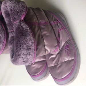 Never worn winter boots by North face. These are so cozy with fuzzy inside and down filled outer. Cute purple material. Size 4