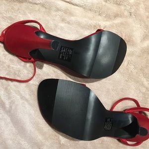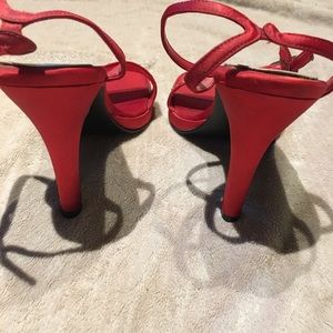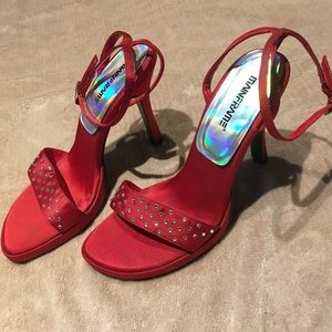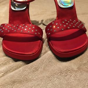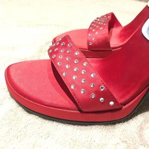 Retro 90’s Mainframe red satin heels with silver rhinestones. Heel & Ankle strap with silver buckle (worn). Rubber soles and heel in excellent condition.