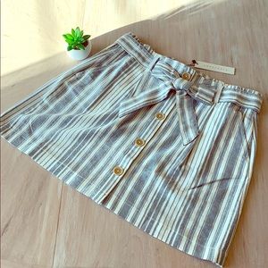 Striped with button detail and belt, elastic waist, front and back pockets. This skirt is a must have this summer.