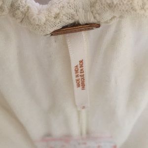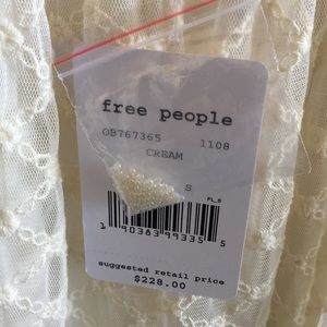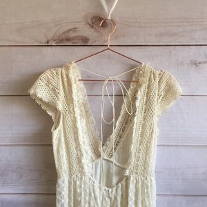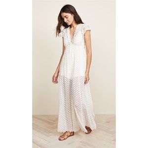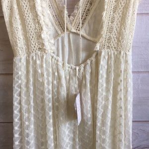 New with tags, never worn. Beautiful cream colored bohemian jumpsuit with embroidered mesh/lace, ruffle trim, wide-leg cut, ankle length, v-neck, open back, toe at neckline, sheer, partially lined.