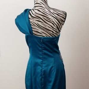 Teal/turquoise sateen dress with beautiful folds to accentuate the curves.