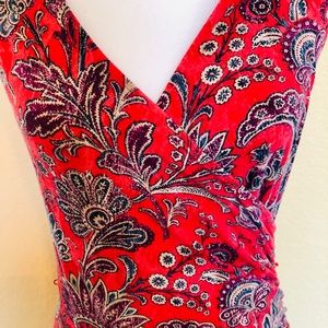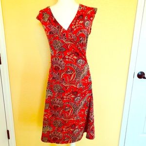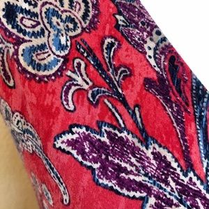 This colorful sundress is perfect for Spring or Summer! It feels like it is made so well! Very soft and comfortable! It bunches on one side for a flattering fit. The colors in it are red, purple, and blue. Comes from a smoke free home.