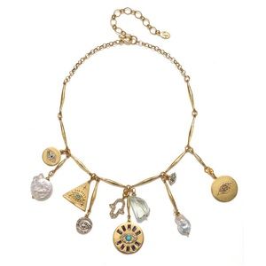 The Athena Evil Eye & Pearl Talisman Necklace features charms created from original Sequin Illustrations. Wear this collection of mystical amulets and treasures from the sea to repel negative energy.