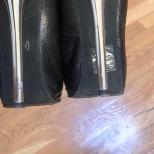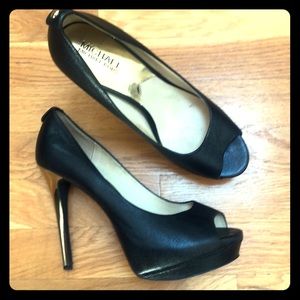 Michael Kors peep toe w/ gold heels. In really good condition. There is a very small scuff on left shoe not visible during wear. Also there is is small scuff on back of left heel. However, these are super comfortable because of platform. You can wear these without worrying about your feet hurting. Heel height is 5 inches. Shoe size 8M.