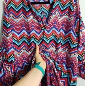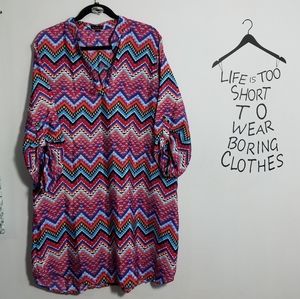 Shift style tunic with lots of room but also belt loops to help define your waist. Very flattering!