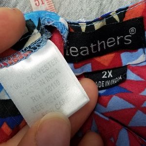 Feathers brand. Size 2X, true to size. No stretch. Measurements shown. Shoulders 18", bust 25", length 38".