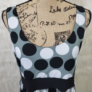 Black, white and grey polka dot dress with thick straps and a flowy bottom. There is a small snag in the front as pictured. Size XL.