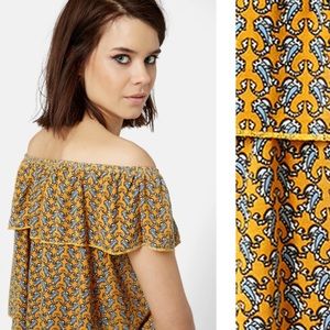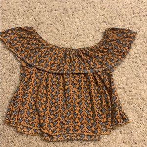 super adorable off-the-shoulder top, with ruffles & a yellow/blue “paisley” pattern.