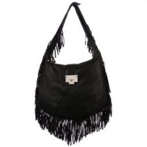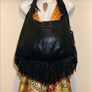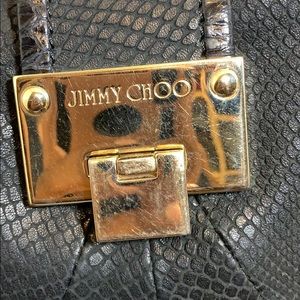 An Authentic Jimmy Choo reptile embossed leather bag. A great light weight bag with gold hardware and fringed detail along the bottom and handle.Microsuede lining in tan for easy cleaning and easy interior viewing.