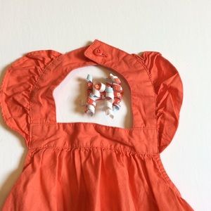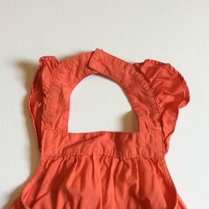 Gymboree coral embroidered halter tunic, back button closure at the neck, ruffle "sleeves" coordinating corkscrew barrette included. Just add white shorts/leggings. Some fading from wash.