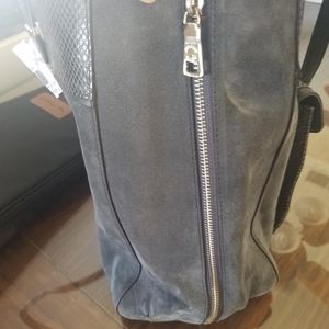Thos brand new with tag coach purse is truly beautiful and amazing. It has a gray suede and snake pattern. There is an exterior pouch on the front. On the inside there is a zipper pouch and a place for a cell phone and small pouch next to it.