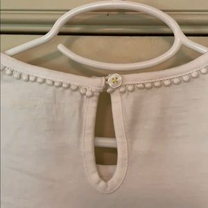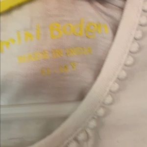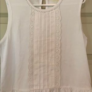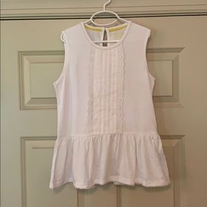 Mini Boden white sleeveless shirt with eyelet detail on the front, and a peplum waist. Size 11-12. Cute edging around neckline and hem. Single button at back of neck. NWOT. Smoke free, pet friendly home. Bundle for a discount!