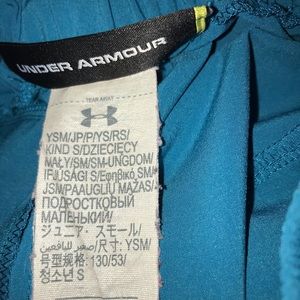 Beautiful dark teal girls size small athletic shorts, with gray drawstring tie waistband and side logo, pleated detail on sides, 3 inch inseam, heat gear, some stretch , but slimmer fit then play-up UA shorts. Great Condition! No flaws, Smoke-free and pet-free home.