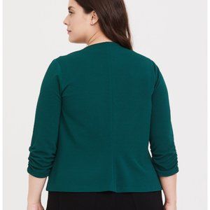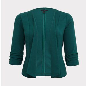 Torrid unstructured green blazer . Top off any work-to-weekend ensemble with this sleek crepe blazer that has gathered sleeves and an open front for the perfect fit.