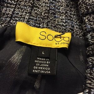 Blue-grey and multicolor SoCa St. John medium-weight wool cardigan with dual patch pockets at front, embellishments throughout and zip closure at front.