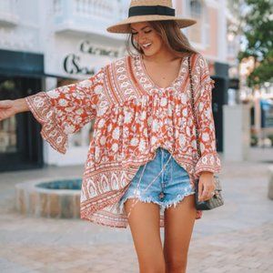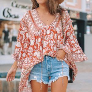 🆕 Last 1🌸Orange Boho Print Free Flowing Tunic