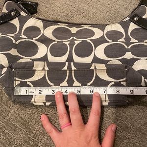 13291 Coach Penelope Shantung Signature Hobo gray black white bag. One outside zipper pocket. Two inside non closure pockets and one inside zipper pocket. Inside satin has some marks.
