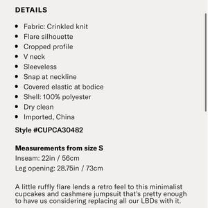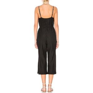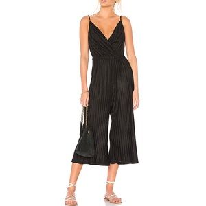 NEW Cupcakes & Cashmere “Austine” sleeveless cropped wide leg jumpsuit featuring wrap v neck with optional snap closure. Adjustable spaghetti straps. Flowy cut, mini-pleat crinkle fabric, ruffle hem.