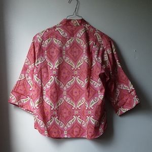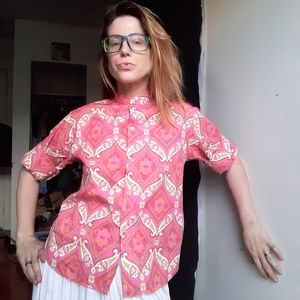 1950's Rockabilly blouse with kaleidoscopic pink, white, and gold pattern. Fabulous concentric diamonds and filigree. Buttons in the front continue all the way up to connect and form a properly retro rolled collar. Sleeves are designed to fold up to or above the eblow. Made in the USA by Kerrybrooke Fashions for Sears, Roebuck, & Co. Listed size is 16. Fits closer to a M, maybe L, see measurements to confirm.